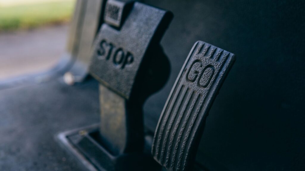 - 右足をブレーキペダルに置き、つま先でブレーキ、踵(または足の外側)でアクセルを軽く煽る。